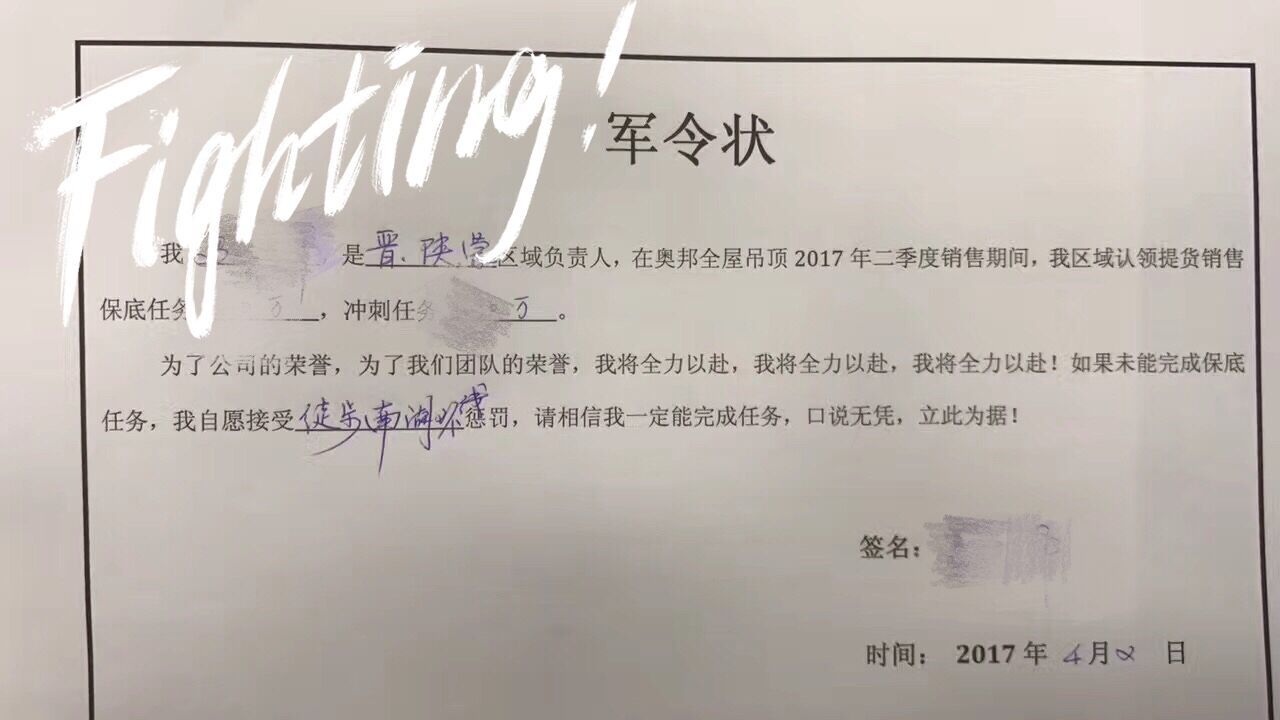 一直以來,奧邦銷售人員深入各省各市,向各地的經(jīng)銷商推廣我們的品牌,闡述我們的理念,介紹我們的產(chǎn)品風(fēng)格——他們的努力換來的是超額完成了我們的銷售目標。品牌不僅僅需要銷售業(yè)績,新客戶的開發(fā)也尤為重要,而在第二季度,奧邦的新客戶開發(fā)目標也十分明確。會上,各位銷售精英激昂地爭做優(yōu)秀營銷者,更是現(xiàn)場立下“軍令狀”,誓要為榮譽而戰(zhàn)!讓我們拭目以待,相信他們定不會辜負公司的期待!